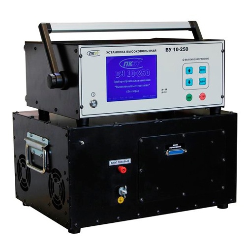 Установка высоковольтная ВУ 10-250 создана для генерирования напряжения переменного тока синусоидальной формы частотой 50 Гц, напряжения постоянного тока, а также измерения напряжения и силы переменного и постоянного токов при проведении испытаний и диагностировании объектов и материалов, для испытаний которых требуется высокое напряжение.